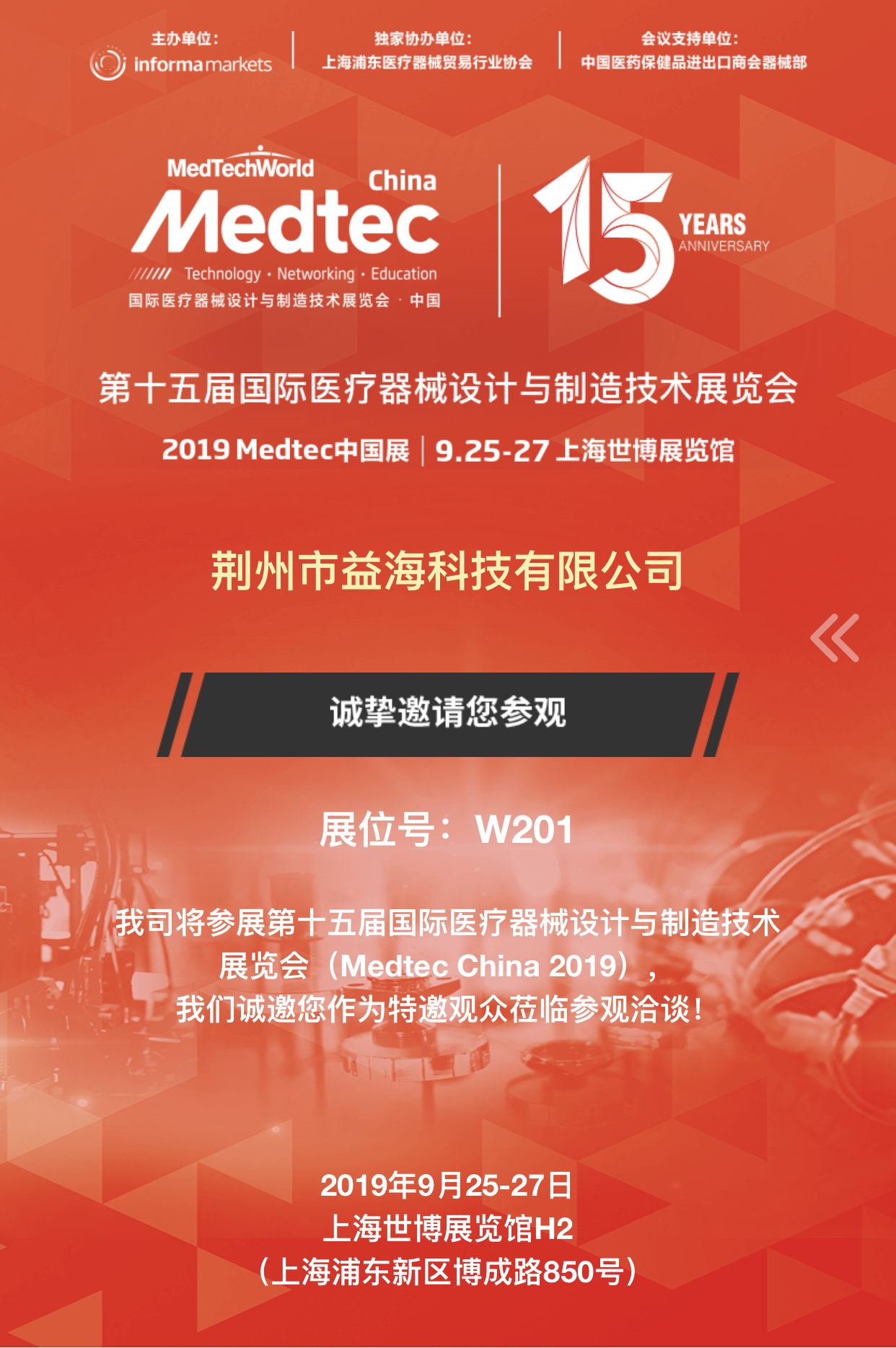 我司將參展第十五屆國際醫療器械設計與制造技術(shù)展覽會(huì )(Medtec China 2019),展位號:W201.我們誠邀您作為特邀觀(guān)眾蒞臨參觀(guān)洽談!